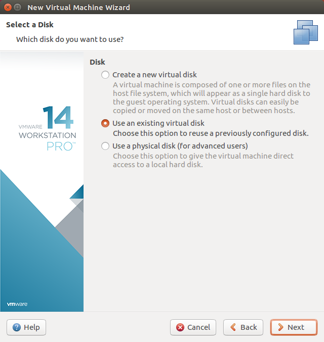 在「Select a Disk」页面中,点击「Use an existing virtual disk」选项,并点「Next」按钮。