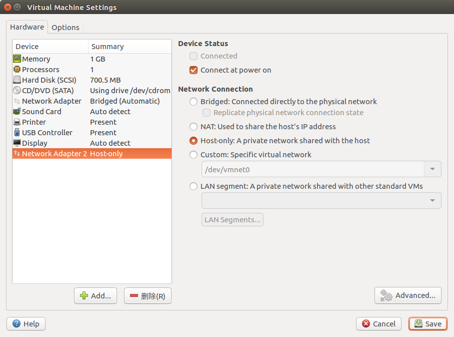 将新增的网卡「Network Connection」更改为「Host-only: Aprivate network shared with the host」,并点「Save」按钮保存配置。