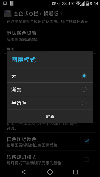 这是一款可以实现状态栏和虚拟键导航栏变色的xposed插件。可实现状态栏、虚拟键颜色和应用颜色融为一体。看起来像是沉浸模式的样子。 🙂